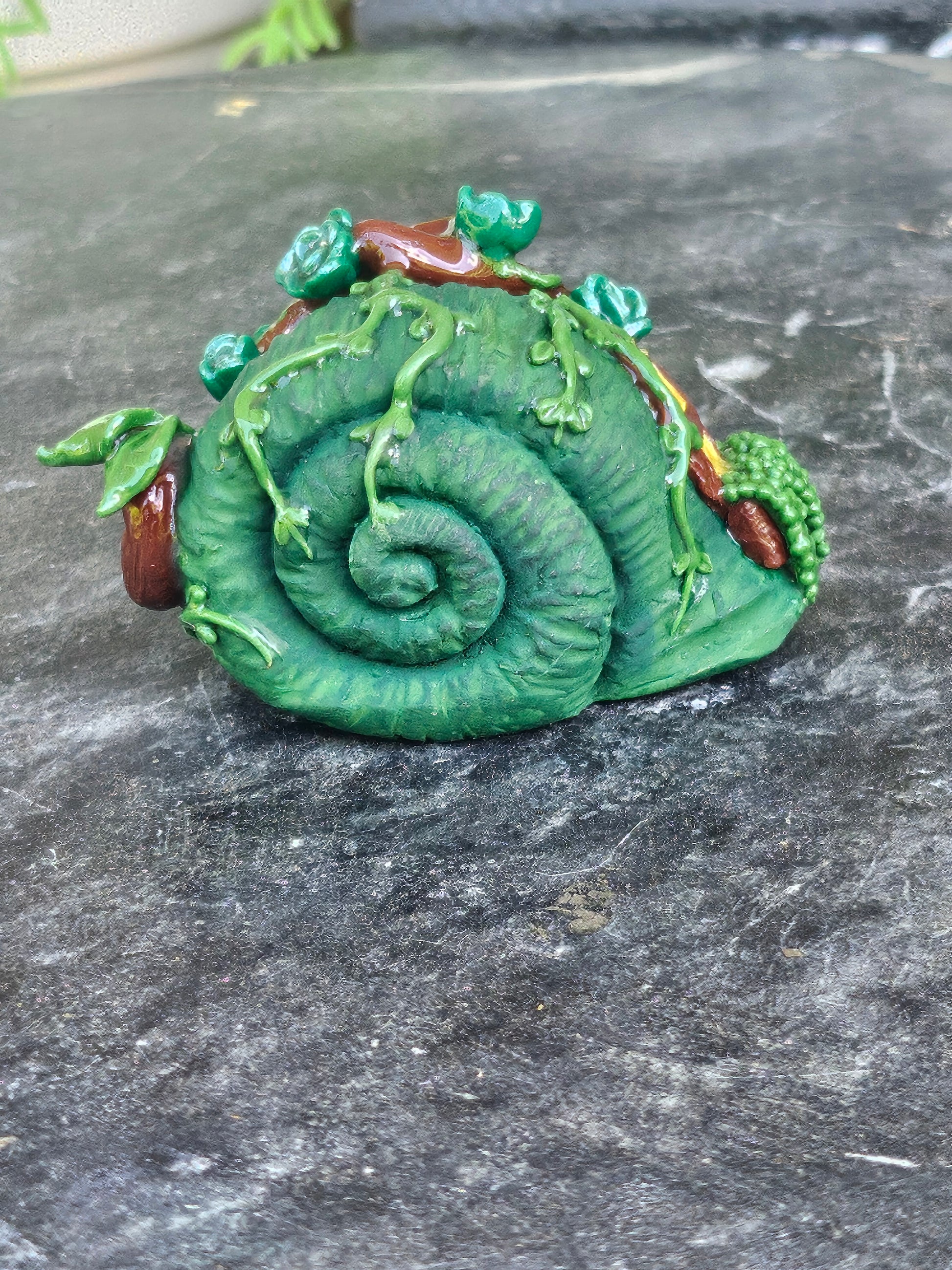 A wooden cottage door rests against the shell, framed by creeping vines and tiny matching green roses. Golden hinges glint in the light, while a leaf-shaped mailbox waits by the door. A glowing window spills soft golden warmth over a planter box of mother-of-pearl vines that drape gently down the sides—perfect for snails who like to come home to something cozy.